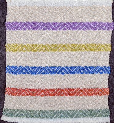 This is the sample woven on four shafts. The regular honeycomb shows the colours through the eyelet holes.